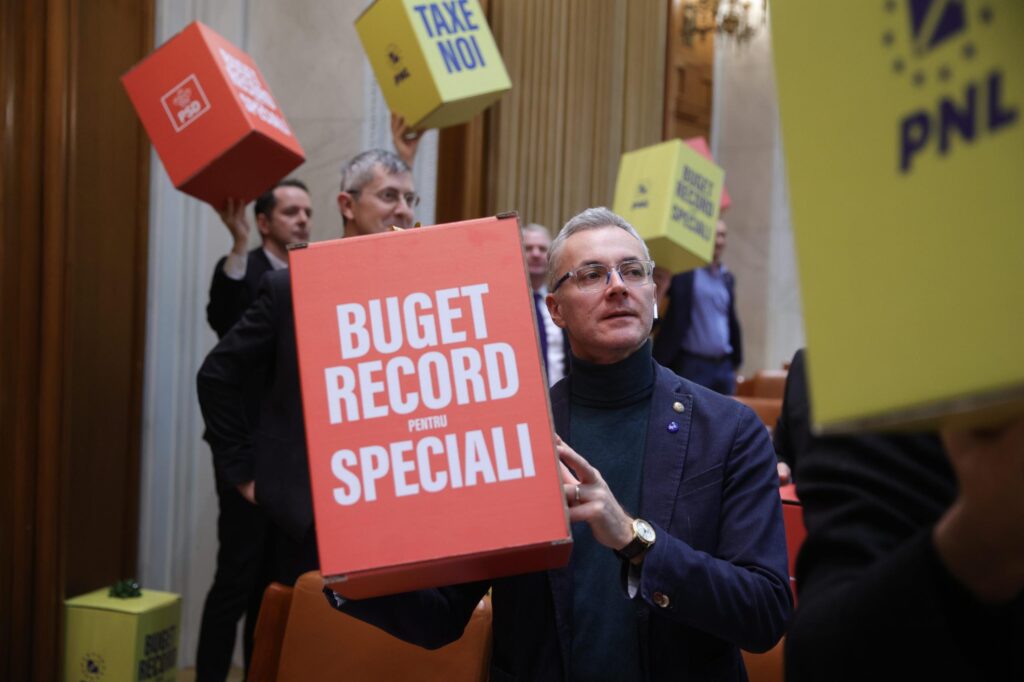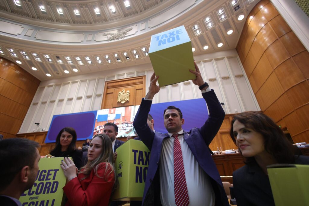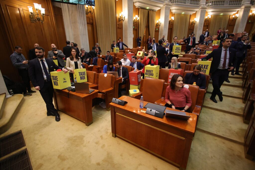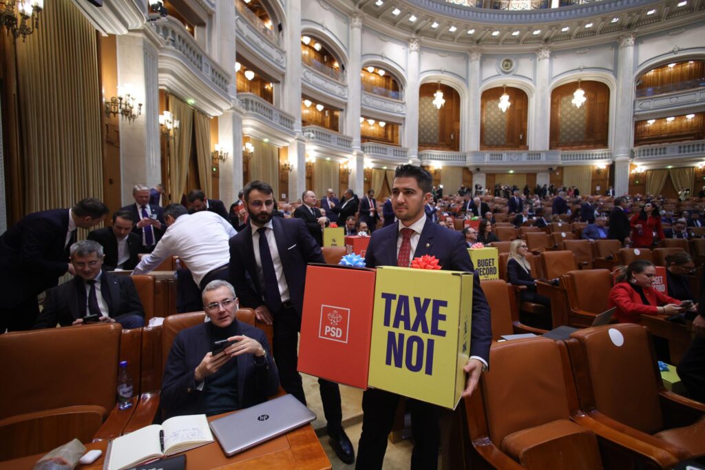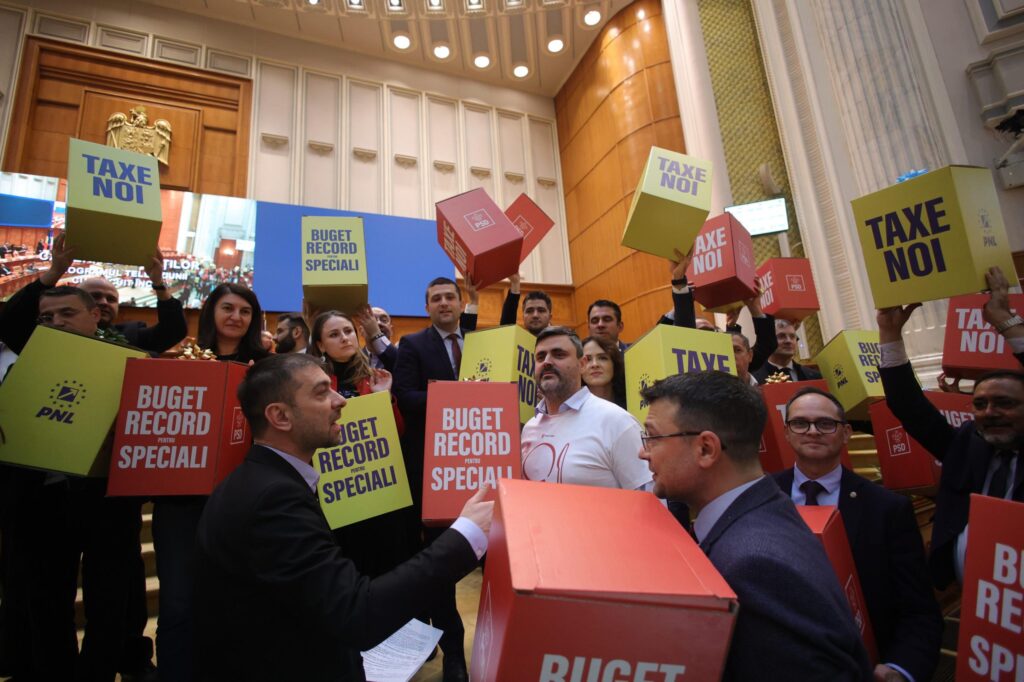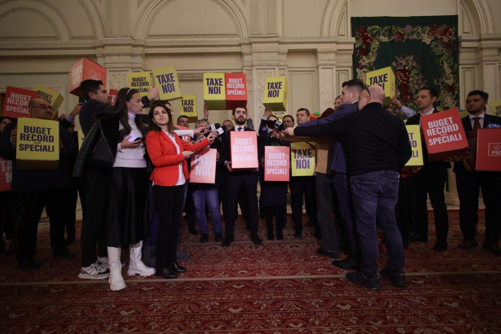 Parlamentarii USR au mers, marți seară, la ședința de plen pe tema bugetului pentru 2024 cu o serie de cutii de cadouri, roșii și galbene, pe care erau scrise mesajele: TAXE NOI și BUGET RECORD pentru SPECIALI.