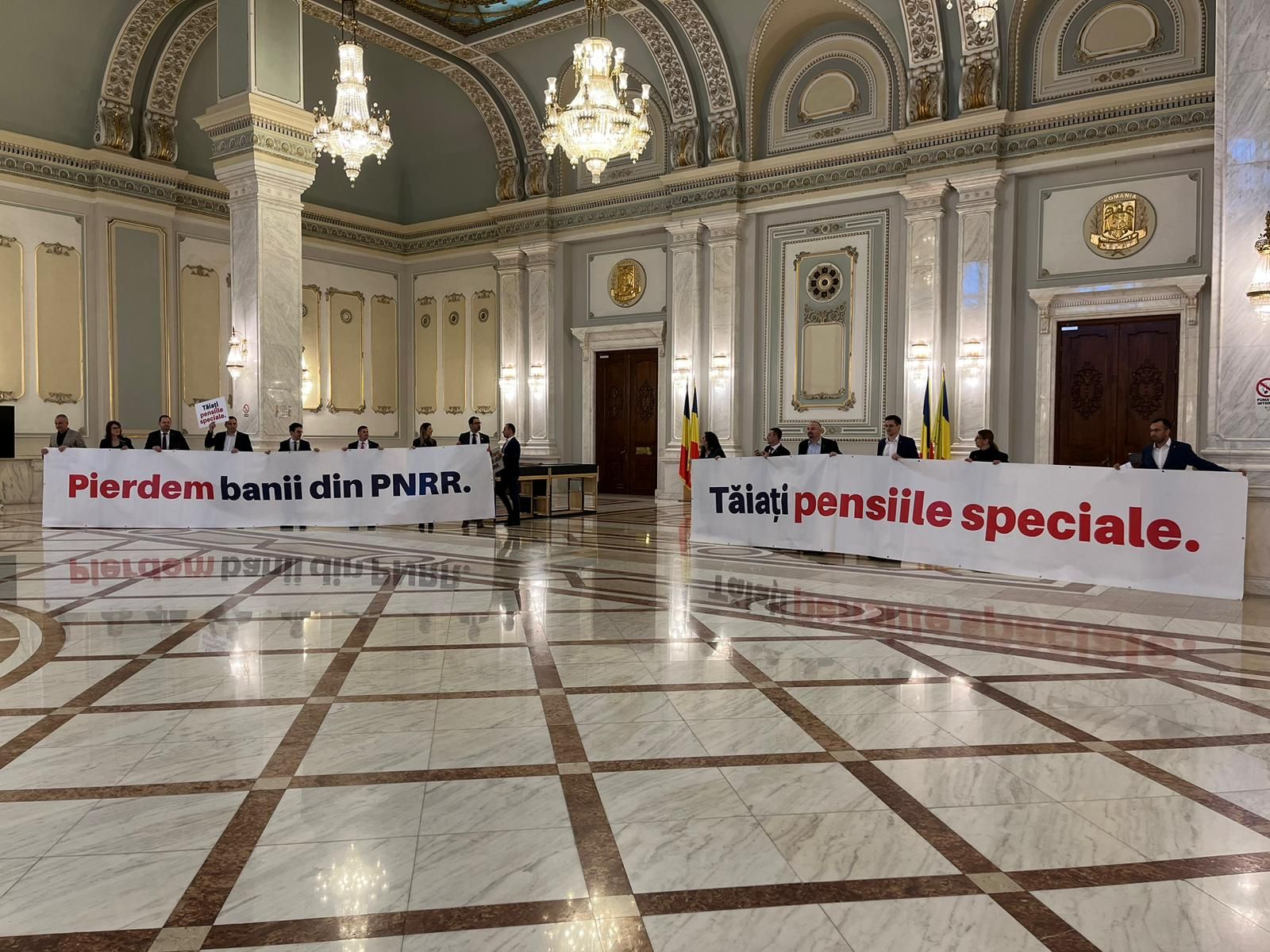 Parlamentarii USR au afișat două bannere și mai multe pancarte cu mesajul: Tăiați pensiile speciale. Pierdem banii din PNRR.