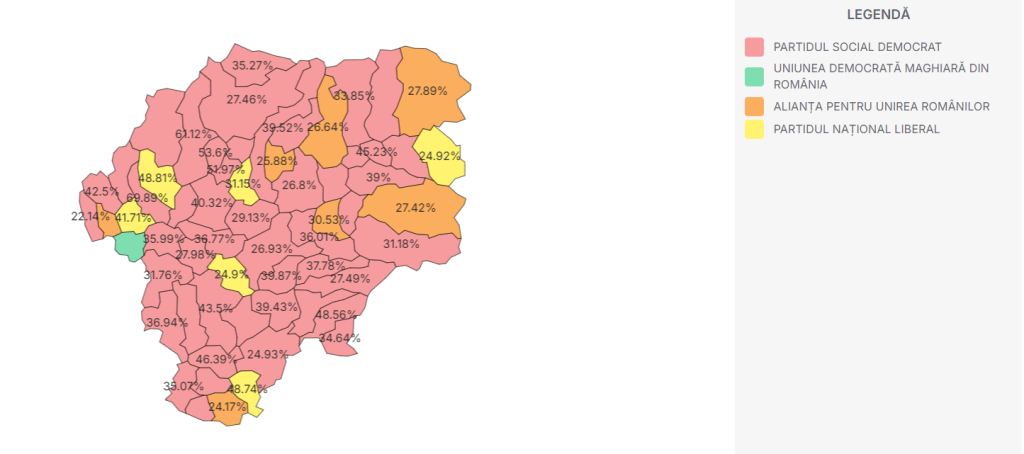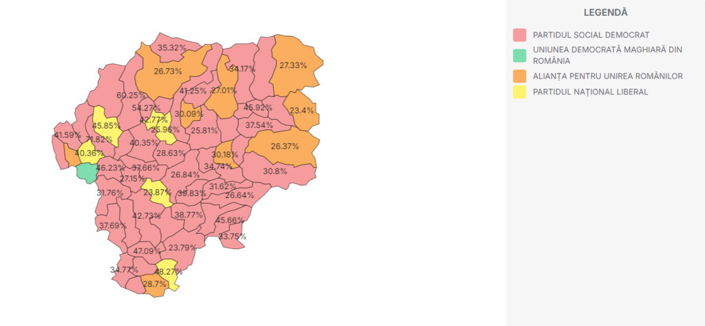 După centralizarea proceselor verbale din toate cele 314 secții de votare din județ, PSD a obţinut 31,29% din voturi, atât la Senat, cât și la Camera Deputaților, AUR – 16,75% la Senat și 16,97% la Camera Deputaților, PNL – 15,67% la Senat și 15,64% la Camera Deputaților.
