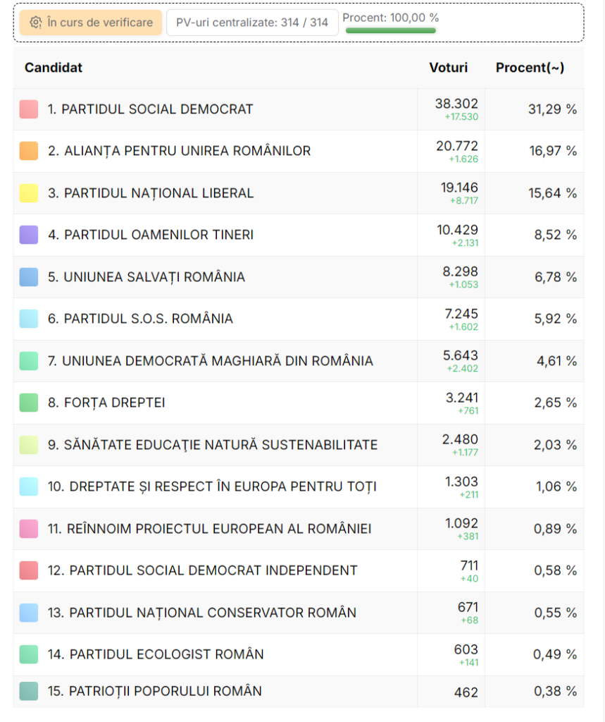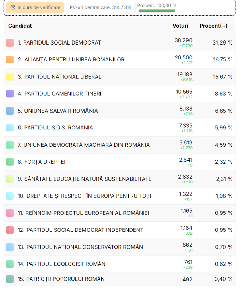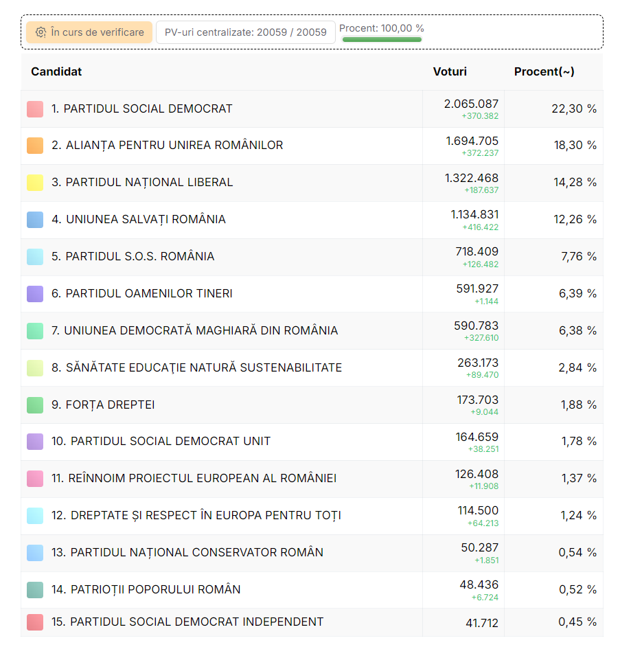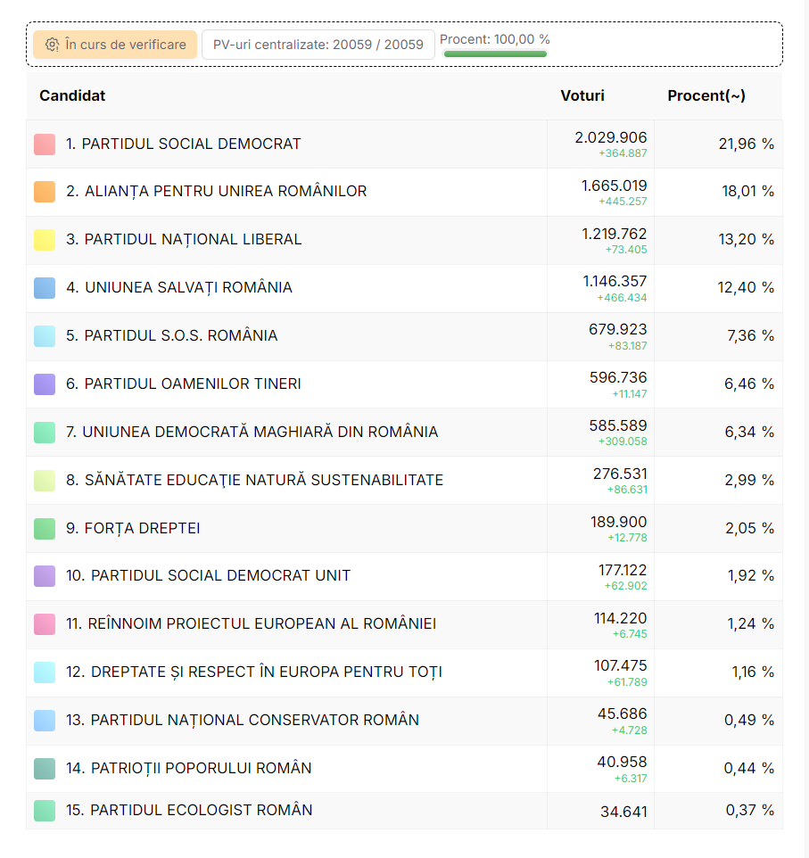 Următoarele partide care au obţinut cel puţin 5% din voturile alegătorilor sunt POT (8,63% la Senat și 8,52% la Camera Deputaților), USR (6,65% la Senat și 6,78% la Camera Deputaților) şi SOS România (5,99 % la Senat și 5,92% la Camera Deputaților).