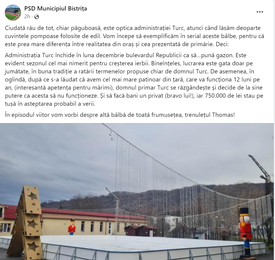 ”Ciudată rău de tot, chiar păguboasă, este optica administrației Turc, atunci când lăsăm deoparte cuvintele pompoase folosite de edil. Vom începe să exemplificăm în serial aceste bâlbe, pentru că este prea mare diferența între realitatea din oraș și cea prezentată de primărie. Deci: Administrația Turc închide în luna decembrie bulevardul Republicii ca să…pună gazon. Este evident sezonul cel mai nimerit pentru creșterea ierbii. Bineînțeles, lucrarea este gata doar pe jumătate, în buna tradiție a ratării termenelor propuse chiar de domnul Turc. De asemenea, în oglindă, după ce s-a lăudat că avem cel mai mare patinoar din țară, care va funcționa 12 luni pe an, (interesantă apetența pentru mărimi), domnul primar Turc se răzgândește și decide de la sine putere ca acesta să nu funcționeze. Și să facă bani un privat (bravo lui!), iar 750.000 de lei stau pe tușă în așteptarea probabil a verii. În episodul viitor vom vorbi despre altă bâlbă de toată frumusețea, trenulețul Thomas!”, a transmis PSD Bistrița, într-un mesaj postat pe o rețea de socializare.