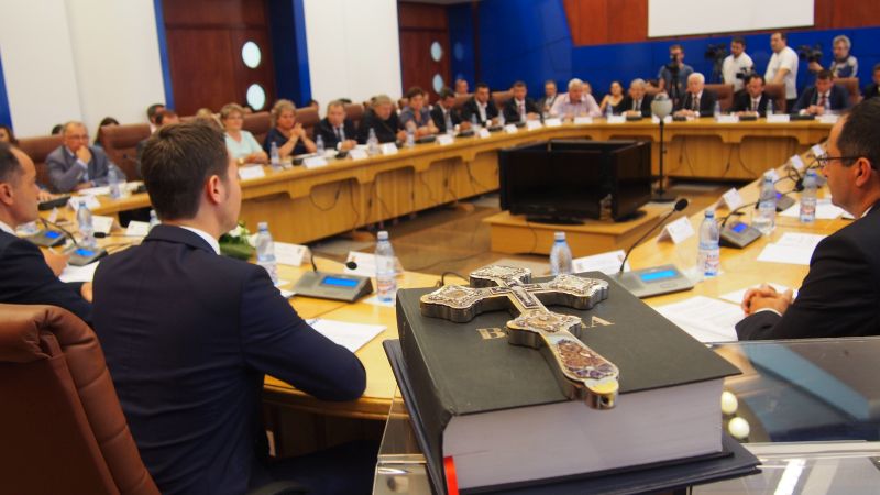 Cu mâna pe Biblie, aleșii județeni au rostit: „Jur să respect Constituția României și legile țării și să fac cu bună credință tot ce stă în puterile și în priceperea mea pentru binele locuitorilor județului. Așa să mă ajute Dumnezeu.”