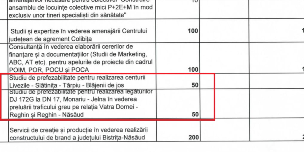 Varianta ocolitoare pentru traficul greu pe ruta Reghin – Vatra Dornei s-ar face prin Monariu – Jelna în vederea preluării traficului greu pe relația (50.000 de lei costul documentațiilor de pre-fezabilitate).