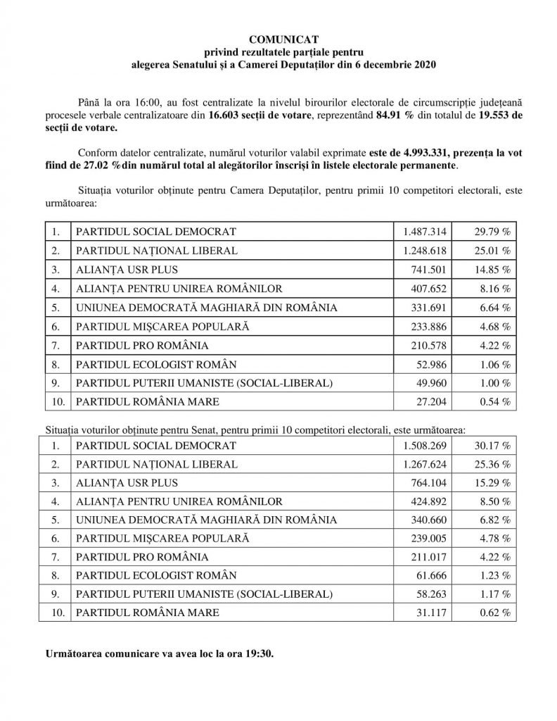 Biroul Electoral Central (BEC) informează că, până la ora 16:00, la nivel național, au fost centralizate procesele verbale din 16.603 secții de votare, ceea ce reprezintă un procent de 84,91% din totalul de 19.553 de secții de votare.