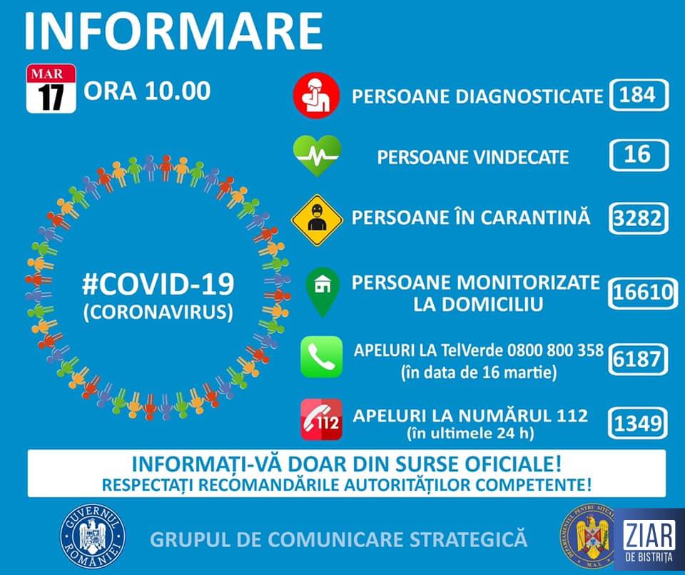Până astăzi, 17 martie, pe teritoriul României, au fost confirmate 184 de cazuri de persoane infectate cu virusul COVID – 19 (coronavirus).