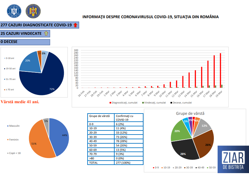Până astăzi, 19 martie, pe teritoriul României, au fost confirmate 277 de cazuri de persoane infectate cu virusul COVID – 19 (coronavirus). Dintre cele 277 de persoane confirmate pozitiv, 25 au fost declarate vindecate și externate ( 16 la Timișoara, 8 la București și unul la Iași).
