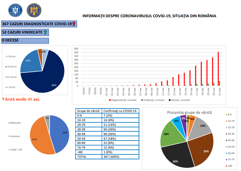 Până astăzi, 21 martie, pe teritoriul României, au fost confirmate 367 de cazuri de persoane infectate cu virusul COVID – 19 (coronavirus). Dintre cele 367 de persoane confirmate pozitiv, 52 au fost declarate vindecate și externate (36 la Timișoara, 11 la București, 3 la Craiova, unul la Constanța și unul la Iași).
