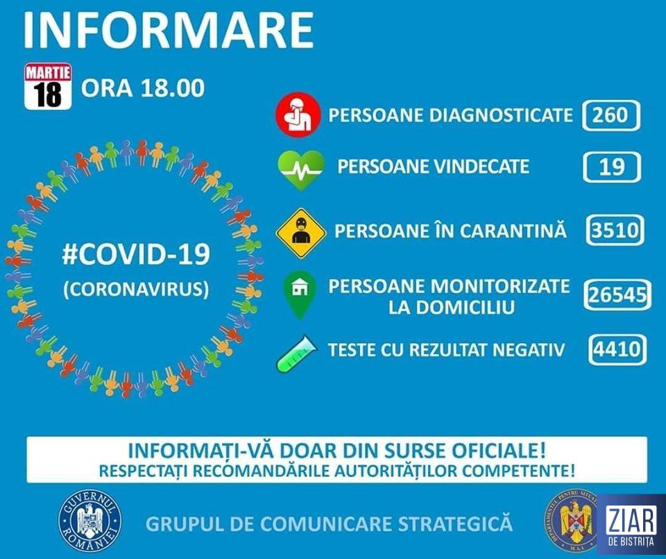 Până astăzi, 18 martie, pe teritoriul României, au fost confirmate 260 de cazuri de persoane infectate cu virusul COVID – 19 (coronavirus). Dintre cei 260 de cetățeni care au contactat virusul, 19 s-au vindecat și au fost externați.
