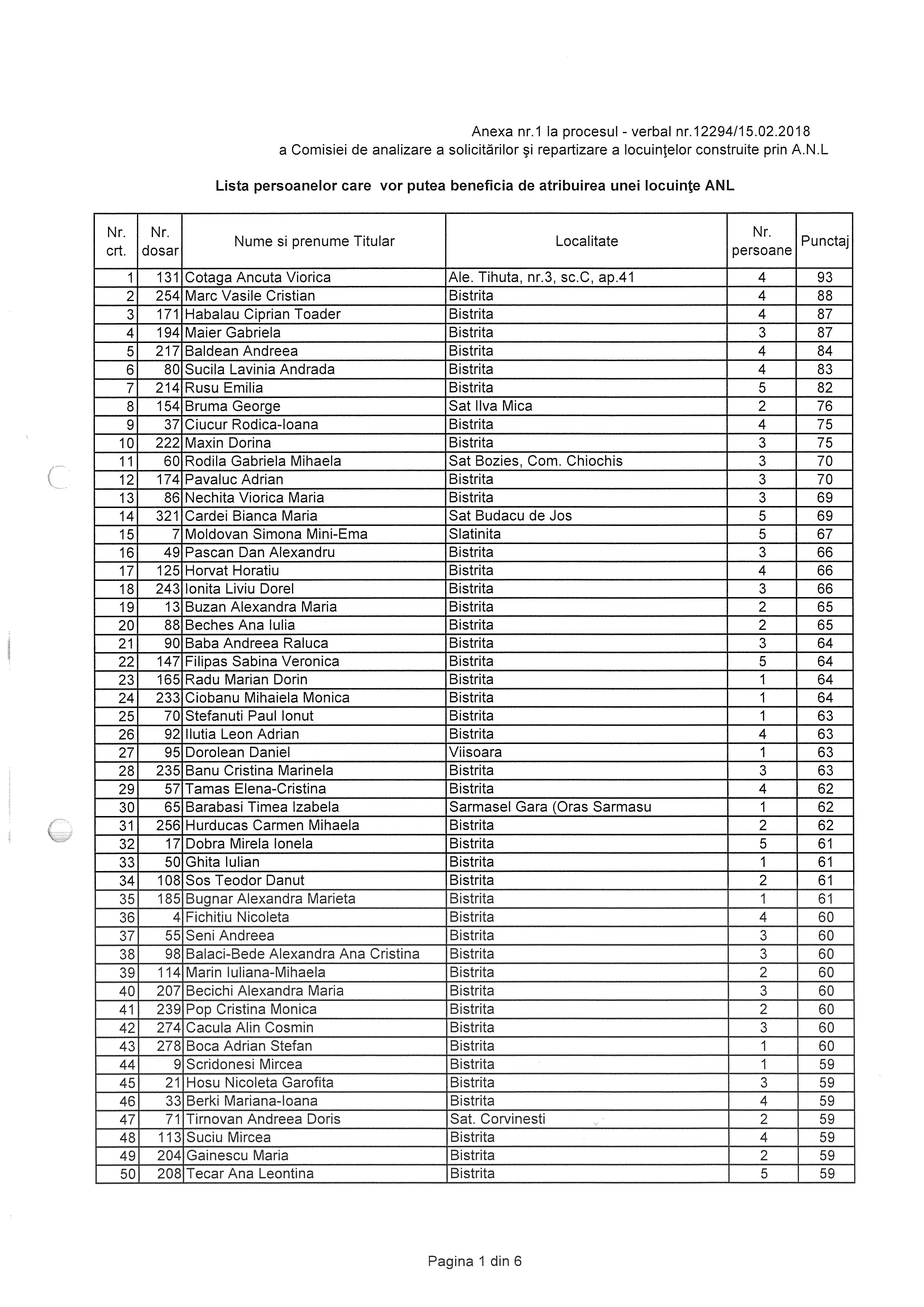Primăria Bistrița NU va mai întocmi o listă de prioritate în viitorul apropiat și rămân în așteptare cei de pe locurile 115 – 300. Tinerii care NU și-au depus dosar pentru solicitarea unei locuințe ANL se pot adresa Primăriei Bistrița, pentru eliberarea uui număr de ordine, pe baza căruia acumulează vechime. O nouă listă de prioritate se va întocmi abia la finalizarea unor noi obiective ANL.