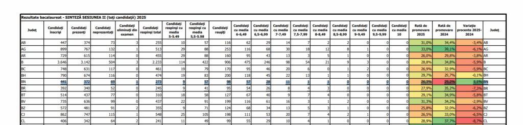 Rata cumulată de promovare (înainte de contestații) pentru județul Bistrița-Năsăud este de 26,3%. Potrivit Inspectoratului Școlar Județean, au promovat 98 de candidați, dintr-un total de 372 de candidați prezenți.