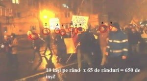 Filmare de mai sus arată că pe fiecare rând sunt maxim 10 oameni, iar în total sunt aproximativ 65 de rânduri. TOTAL: 650 de oameni prezenți în grupul care a făcut turul orașului. Piața de la Prefectură era aproape-goală, ceea ce arată că numărul real al celor prezenți în stradă a fost maxim 1.000 de oameni. (presupunând că mulțimea a scăzut treptat odată cu turul orașului),