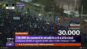 Posturile naționale au prezentat cifre exgerate: Digi zice că au fost 25.000 de oameni, TVR 1 spune că au fost 120.000, iar Realitatea TV anunțat 150.000 de oameni în Piața Victoriei.