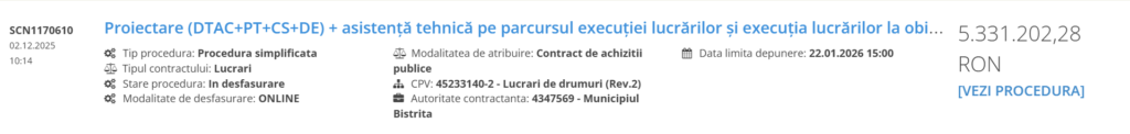 Investiția este finanțată prin PNRR, bugetul de stat și bugetul local. Valoarea totală estimată a investiției este de 5.331.202,28 lei fără TVA, din care 207.000 lei reprezintă serviciile de proiectare și asistență tehnică, iar 5.124.202,28 lei – execuția lucrărilor. Companiile interesate să participe la licitația lansată de Primăria Bistrița pot depune oferte până la data de 22 ianuarie 2026.