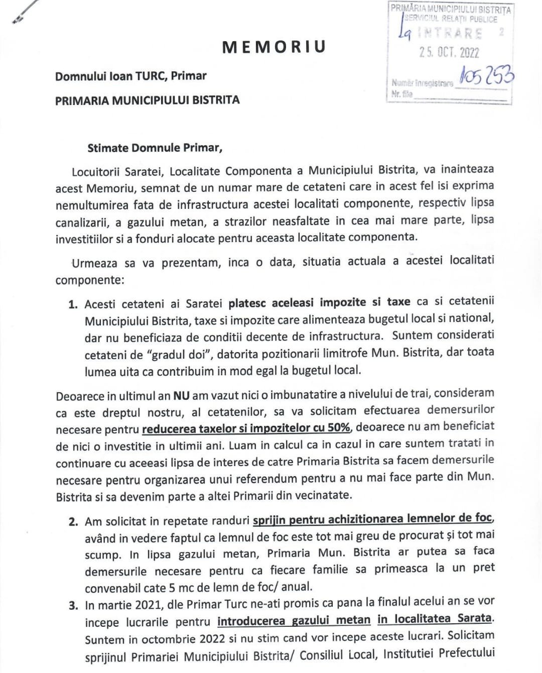 Marţi, 25 octombrie 2022, echipa de cetăţeni care s-a mobilizat în strângerea de semnături (Claudiu Gălpeanu, Cristian Nicora, Corina Iakab, Andreea Durla, Melinda Emrich, Angela Marcela Adam, Zoli Maroşan, Mihai Weber, Ioan Octavian Gălpian, Adrian Sângeorzan etc.) au depus la Primăria Bistriţa MEMORIUL de mai jos, în care sunt punctate alături de plângerile generale şi nevoia de lemne de foc pentru încălzirea din iarna aceasta.