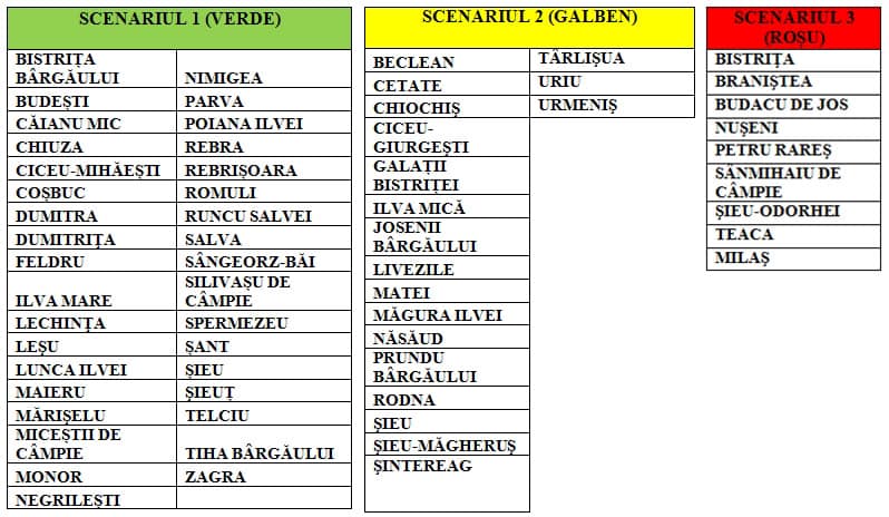 În ceea ce privește mediul urban, în municipiul Bistrița se aplică scenariul roșu, în vreme ce în orașele Beclean și Năsăud se aplică scenariul galben, iar în orașul Sângeorz-Băi se aplică scenariul verde.