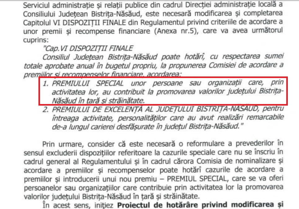 “Consiliul Județean poate hotărî cu respectarea sumei, acordarea unui premiu SPECIAL unor persoane sau organizații care prin activitatea lor au contribuit la promovarea valorilor județului Bistrița – Năsăud.” – după cum se arată în proiectul de hotărâre.