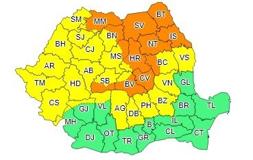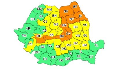 Fenomene vizate: ploi abundente. În jumătatea de nord a Moldovei, zona Carpaților Orientali, local în Maramureș și în sud-estul Transilvaniei temporar va ploua abundent și se vor acumula cantități de apă de 40…50 l/mp și pe arii restrânse 60…70 l/mp.