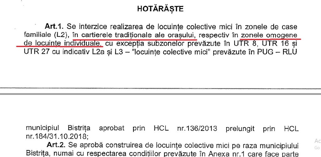 Art. 1 – se interzice construirea de locuințe colective mici în zonele de case L2, în cartierele tradiționale ale orașului, respectiv în zonele omogene de locuințe individuale , cu excepția subzonelor prevăzute în UTR 8 (zona Alba -Iulia-Odobescu-Toamnei), UTR 16 (zona Libertății – MAT) și UTR 27 (peste calea ferată, zona cuprinsă între Netex și Drumul Dumitrei Vechi), cu indicativ L2a și L3 – locuințe colective mici, prevăzute în PUG, aprobat prin HCL nr. 136 din 2013.