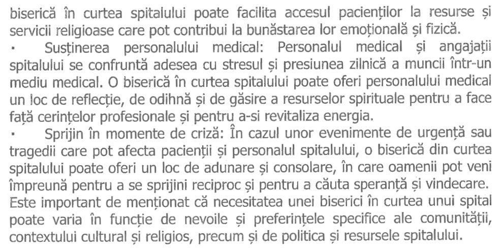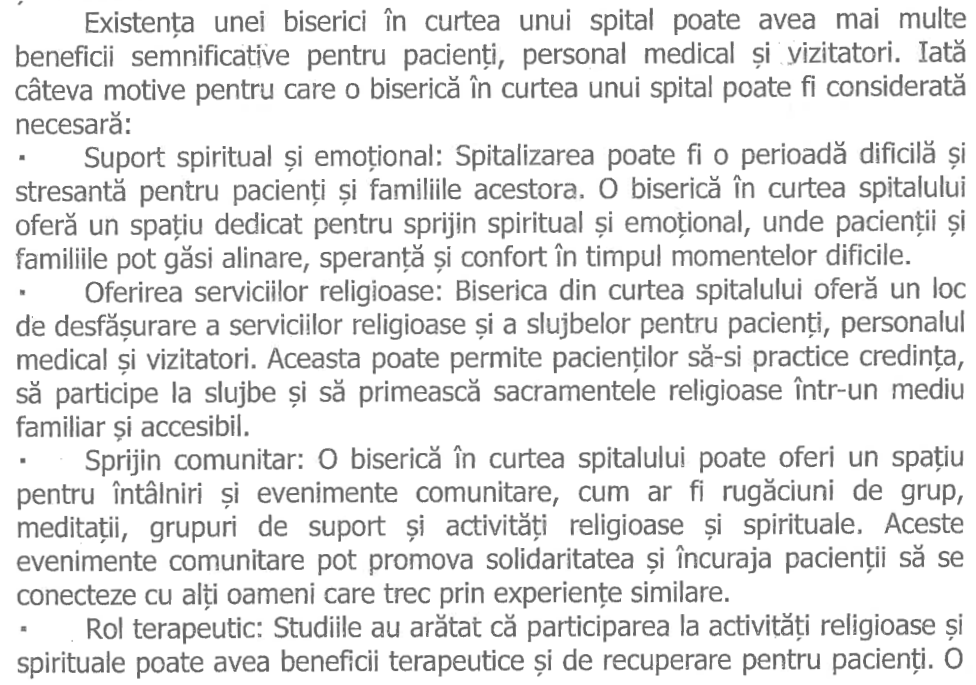 ”Având în vedere procesul de dezvoltare și modernizare a Spitalului Clinic Județean de Urgență Bistrița susținut de Consiliul Județean Bistrița-Năsăud, numărul mare de pacienți ai unității sanitare și spațiul insuficient alocat în prezent capelei ”Sfântul Apostol și Evanghelist Luca”, de rit ortodox, ce funcționează în prezent la parterul spitalului, conducerea unității sanitare propune relocarea acesteia și realizarea unui nou lăcaș de cult „Biserica Sfântul Apostol și Evanghelist Luca”, pe terenul aferent curții spitalului. Soluția propusă vine și ca o măsură de precauție pentru a se evita activitățile cu foc deschis care se desfășoară în capelă, conform ritualurilor bisericești, în fapt o condiție obligatorie pentru obținerea Autorizației de securitate la incendiu după finalizarea lucrărilor de investiții care se realizează în cadrul proiectului finanțat prin PNRR”, se arată în proiectul de hotărâre adoptat de Consiliul Județean Bistrița-Năsăud.