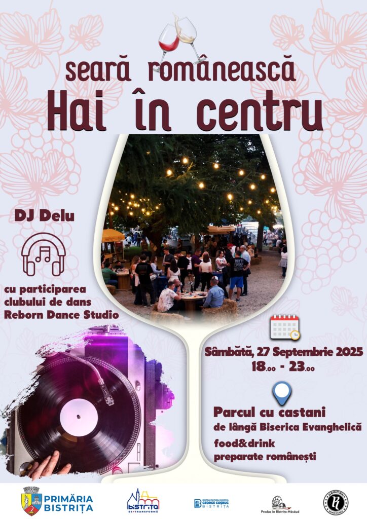 Sâmbătă, 27 septembrie, Piața Centrală din Bistrița va găzdui o seară dedicată gusturilor și tradițiilor românești. Sub castanii din centrul orașului, bistrițenii sunt invitați să deguste preparate autentice și băuturi locale, într-o atmosferă de relaxare și socializare.