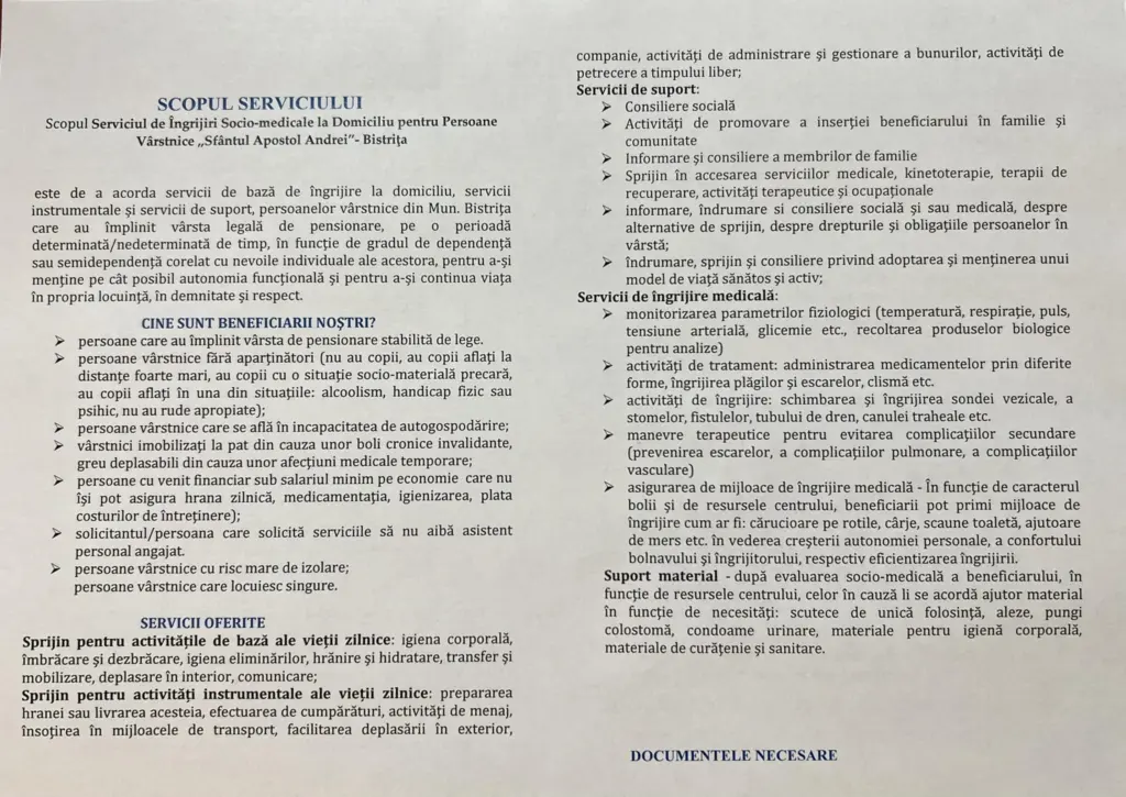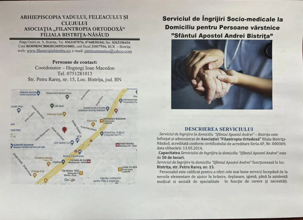 Asociația Filantropia Ortodoxă Bistrița-Năsăud, prin intermediul Serviciului de îngrijiri socio-medicale la domiciliu pentru persoane vârstnice ”Sfântul Apostol Andrei” Bistrița, Piața Petru Rareș Nr. 15, vine în sprijinul persoanelor vârstnice dependente sau semidependente, oferind, gratuit, o gamă variată de servicii menite să îmbunătățească calitatea vieții acestora.
