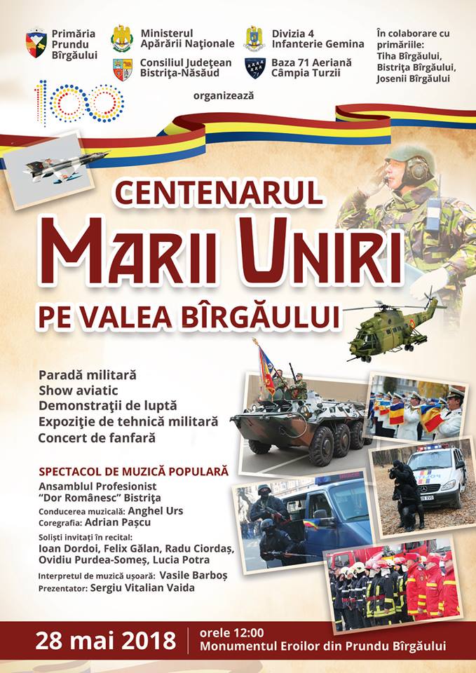 Primul eveniment, „Centenarul Marii Uniri pe Valea Bîrgăului” organizat de Primăria comunei Prundu Bîrgăului, Ministerul Apărării Naţionale, Divizia 4 Infanterie Gemina, Consiliul Judeţean Bistriţa-Năsăud, Baza 71 Aeriană Câmpia Turzii în colaborare cu primăriile Tiha Bîrgăului, Bistriţa Bîrgăului şi Josenii Bîrgăului, va avea loc pe 28 mai, în centrul comunei Prundu Bîrgăului, lângă Monumentul Eroilor.