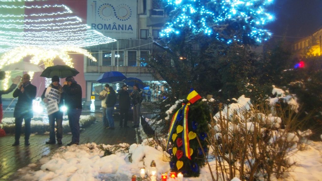 În 22 decembrie, pe o ploaie măruntă, 40 de bistrițeni au ieșit în stradă să-i comemoreze pe Eroii Revoluției! Au depus o coroană FIX în locul troiței care a fost MUTATĂ!