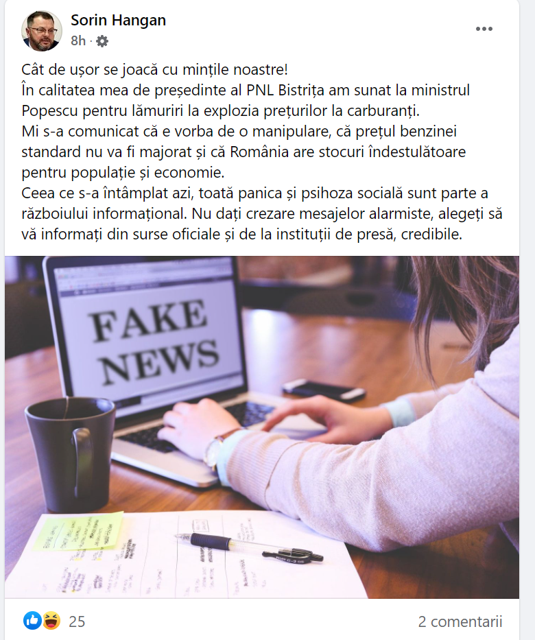 ”Cât de ușor se joacă cu mințile noastre! În calitatea mea de președinte al PNL Bistrița am sunat la ministrul Popescu (n.r. – ministrul Energiei, Virgil Popescu) pentru lămuriri la explozia prețurilor la carburanți. Mi s-a comunicat că e vorba de o manipulare, că prețul benzinei standard nu va fi majorat și că România are stocuri îndestulătoare pentru populație și economie. Ceea ce s-a întâmplat miercuri, toată panica și psihoza socială sunt parte a războiului informațional. Nu dați crezare mesajelor alarmiste, alegeți să vă informați din surse oficiale și de la instituții de presă, credibile”, a scris pe pagina sa de pe o rețea de socializare Sorin Hangan.