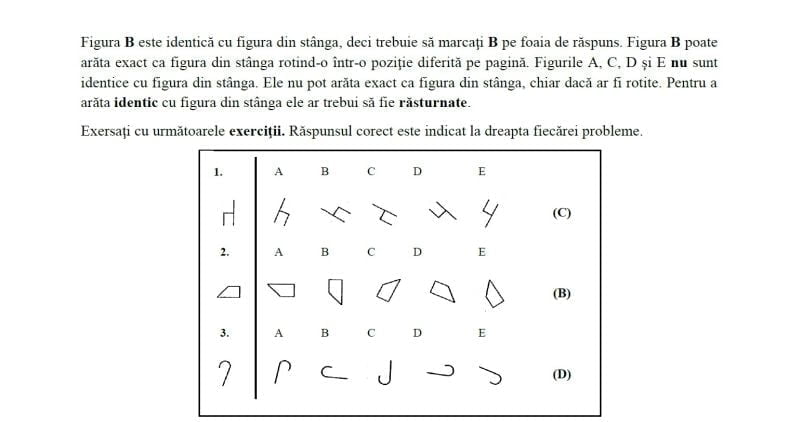 De asemenea, testul a avut și o componentă grafică, respectiv un șir de figuri geometrice din care trebuia extrasă figurina cu aceeași formă ca MODELUL dat.