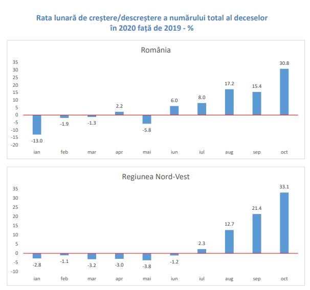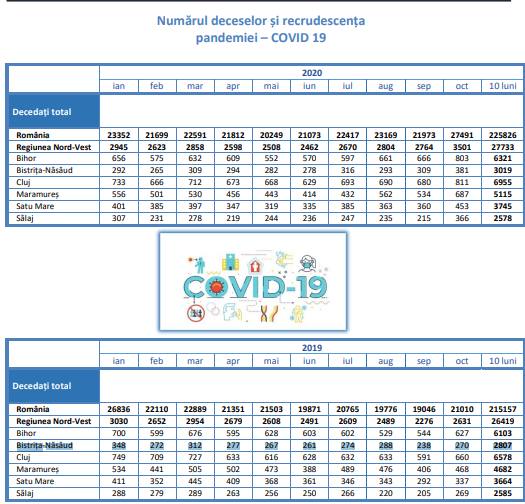 Astfel, potrivit datelor, în intervalul ianuarie – octombrie 2020, în Bistrița-Năsăud au decedat mai multe persoane față de perioada corespunzătoare a anului trecut, creșterea fiind de 212 decese (de la 2.807 decese în primele 10 luni ale anului 2019 la 3.019 decese în primele 10 luni ale anului 2020).