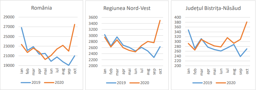 Comparativ cu anul trecut, cele mai multe decese din acest an au fost înregistrate în luna octombrie, când au fost raportate 381 de decese, față de 270 în luna octombrie 2019. Astfel, se poate observa că în luna octombrie 2020 au existat cu 111 decese mai mult decât în luna octombrie a anului 2019.