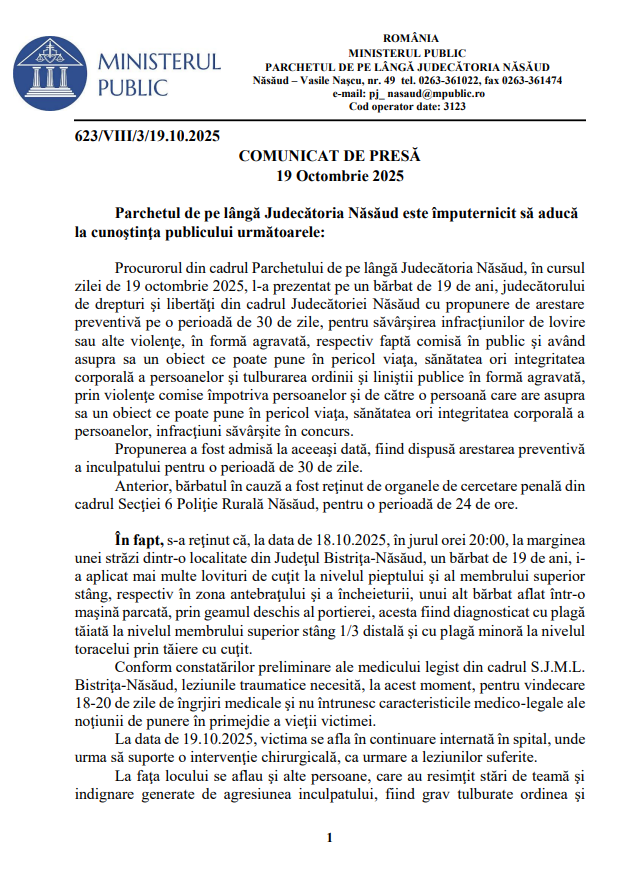 Potrivit Inspectoratului de Poliție Județean Bistrița-Năsăud, în seara zilei de 18 octombrie, în urma unui conflict spontan, tânărul ar fi agresat un bărbat, aplicându-i mai multe lovituri cu un cuțit în zona antebrațului și a toracelui. Victima a fost transportată la spital, unde a primit îngrijiri medicale.