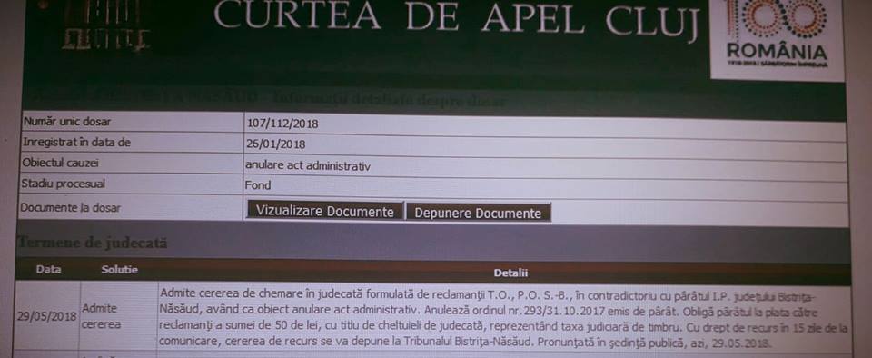 Ordinul Prefectului judeţului Bistriţa-Năsăud nr. 293/31.10.2017 privind constituirea Comisiei pentru coordonarea activităţilor de organizare şi desfăşurare a referendumului local pentru demiterea primarului oraşului Sîngeorz – Băi, judeţul Bistriţa- Năsăud a fost anulat, marți, de Tribunalul Bistrița-Năsăud.
