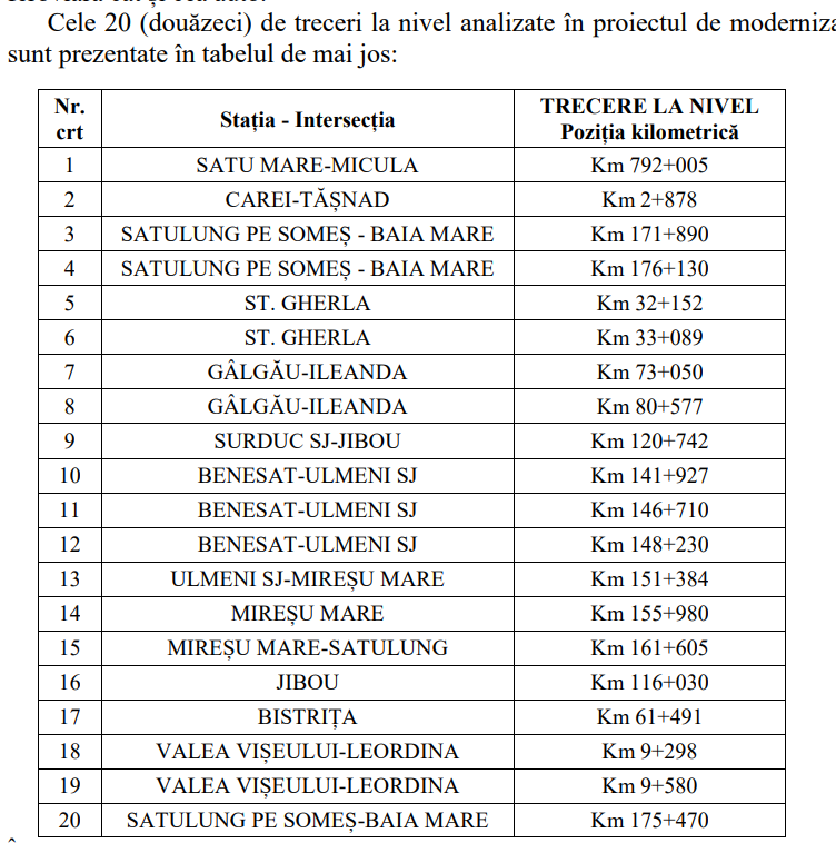 Printre cele 20 de treceri se află și una situată în județul Bistrița-Năsăud, fiind vorba despre trecerea la nivel cu calea ferată de pe strada Ioan Slavici din municipiul Bistrița.