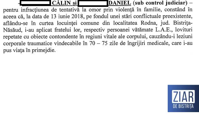 Astfel, pe rolul Tribunalului Bistrița-Năsăud a ajuns un dosar în care au fost trimiși în judecată, la finele lunii martie, doi frați din Rodna, Călin L. și Daniel L. Aceștia sunt acuzați de tentativă de omor prin violență în familie.