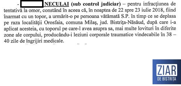 De asemenea, într-un alt dosar, procurorii Parchetului de pe lângă Tribunalul Bistrița-Năsăud au mai trimis în judecată un alt bărbat, pe Neculai D., fiind acuzat tot de tentativă de omor, după ce l-a lovit cu un topor pe un alt bărbat.