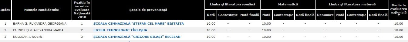 ”Conform primelor rezultate afişate astăzi, în judeţul Bistriţa-Năsăud a fost înregistrat un procent de 75,86% medii peste 5. Trei elevi de la şcolile Şc. Gimn. Grigore Silaşi Beclean, Şc. Gimn. Ştefan cel Mare Bistriţa şi Liceul Tehnologic Tîrlişua au obţinut medii de 10. Pe discipline, statistica notelor de 10 este următoarea: 6 note la matematică şi 56 la limba şi literatura română” informează ISJ B-N.