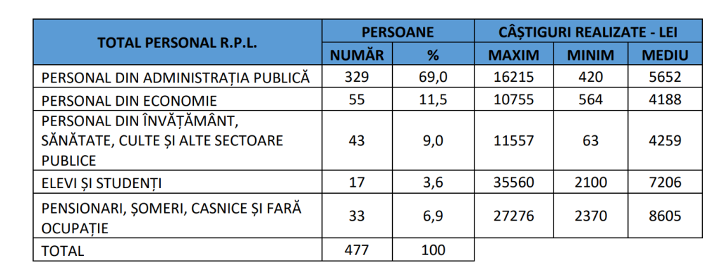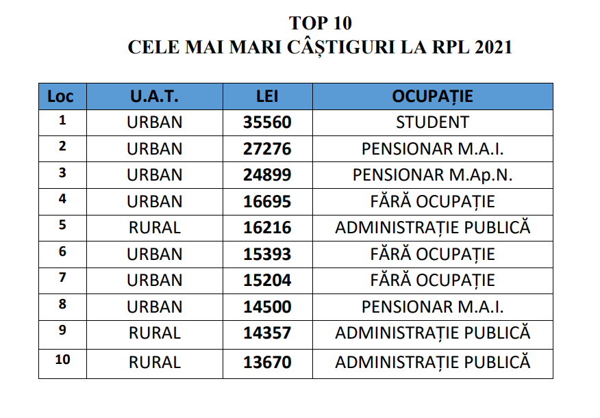 Acesta a fost urmat de un pensionar MAI, cu 27.276 lei, un pensionar MApN, cu 24.899 lei, o persoană fără ocupaţie din mediul urban, cu 16.695 lei, şi de un angajat din administraţia publică din mediul rural, cu 16.216 lei.
