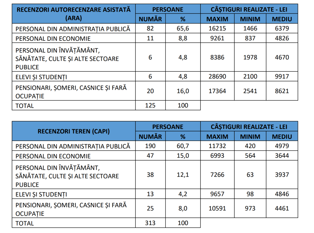 La polul opus, cea mai mică sumă încasată de un recenzor a fost de 63 de lei. ”Câștiguri minime au fost înregistrate în cazul persoanelor care au renunțat la contract în fazele inițiale ale activității”, arată DRS Bistrița-Năsăud.