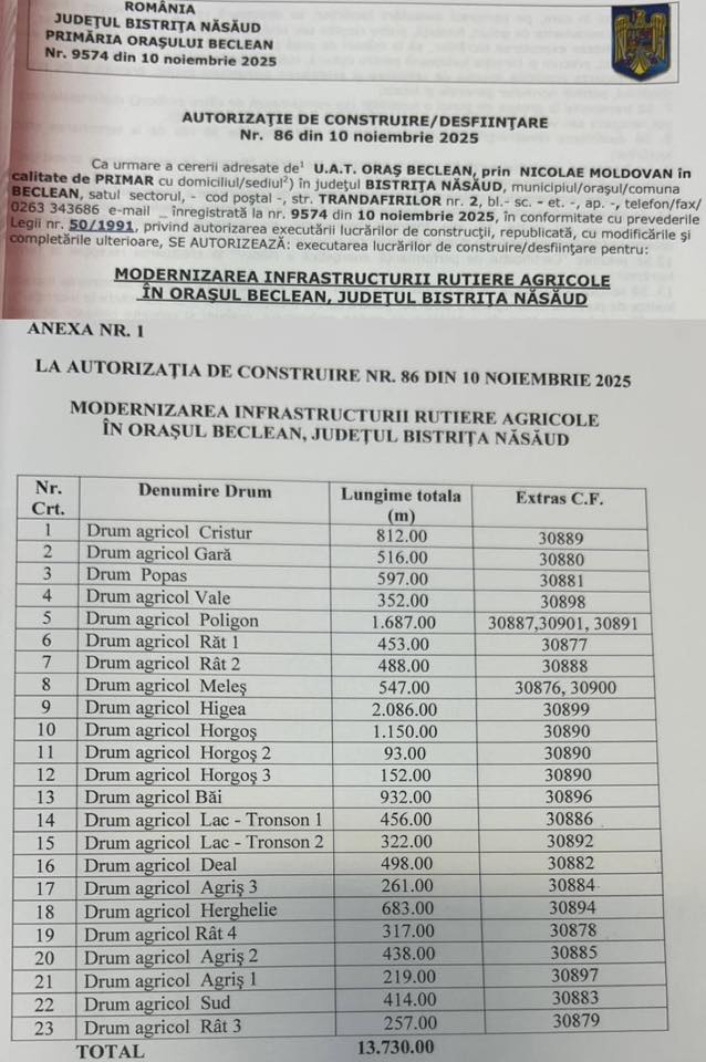 Primarul orașului Beclean, Nicolae Moldovan, a anunțat că a fost emisă autorizația de construire pentru lucrări de modernizare a 14 kilometri de drumuri din oraș și din cartierele aparținătoare.