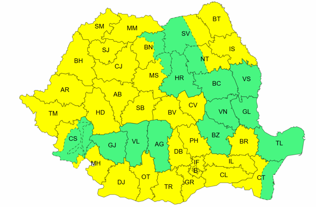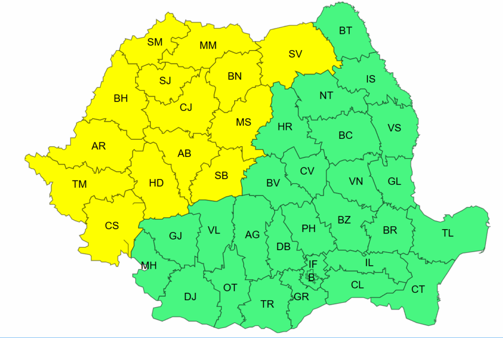 Administrația Națională de Meteorologie (ANM) a emis atenționări cod galben de vreme deosebit de caldă, valabile pentru zilele de joi și vineri în mai multe județe din țară, inclusiv Bistrița-Năsăud.