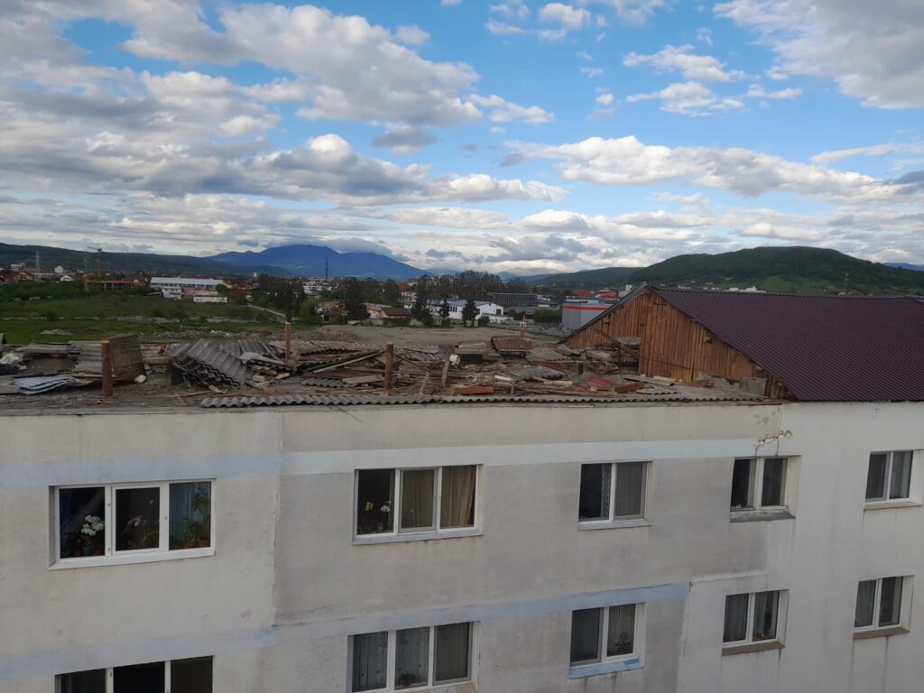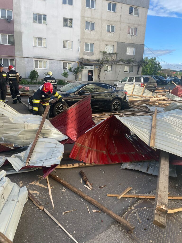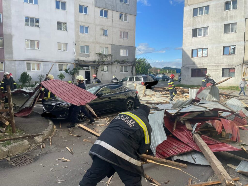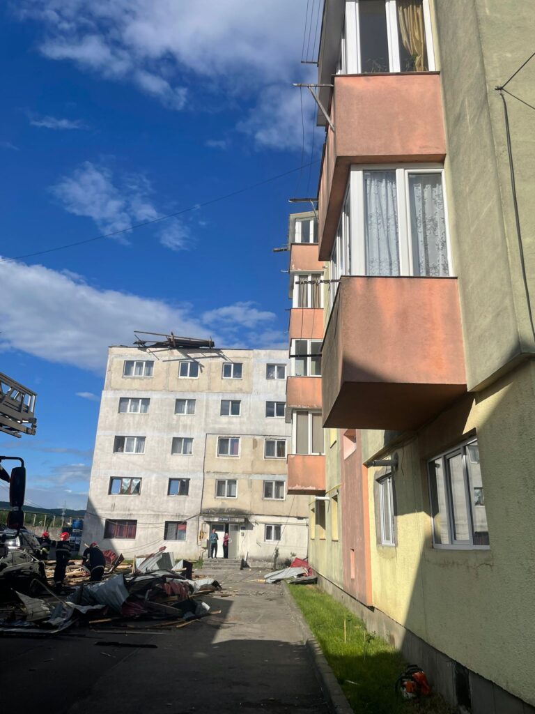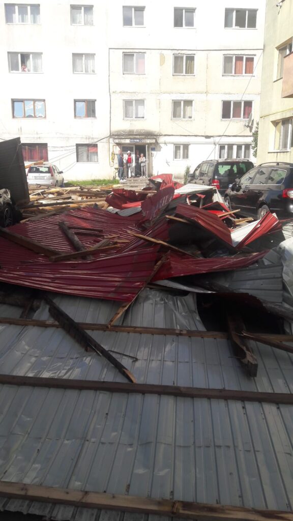 Potrivit Inspectoratului pentru Situații de Urgență Bistrița-Năsăud, pe strada Aleea Fântânele din municipiu, din cauza vântului, mai multe bucăți din acoperișul unui bloc s-au desprins și au căzut, câteva autoturisme parcate în zonă fiind avariate.