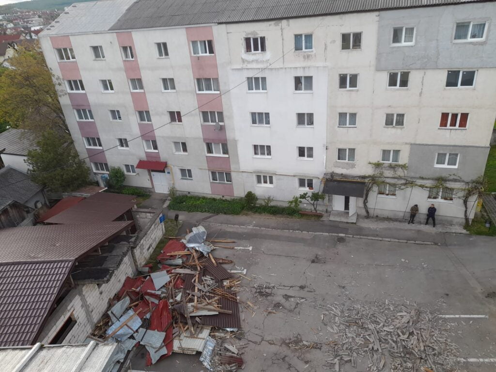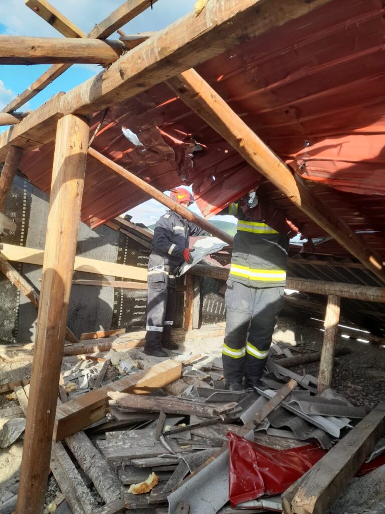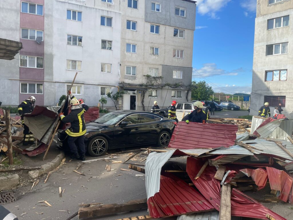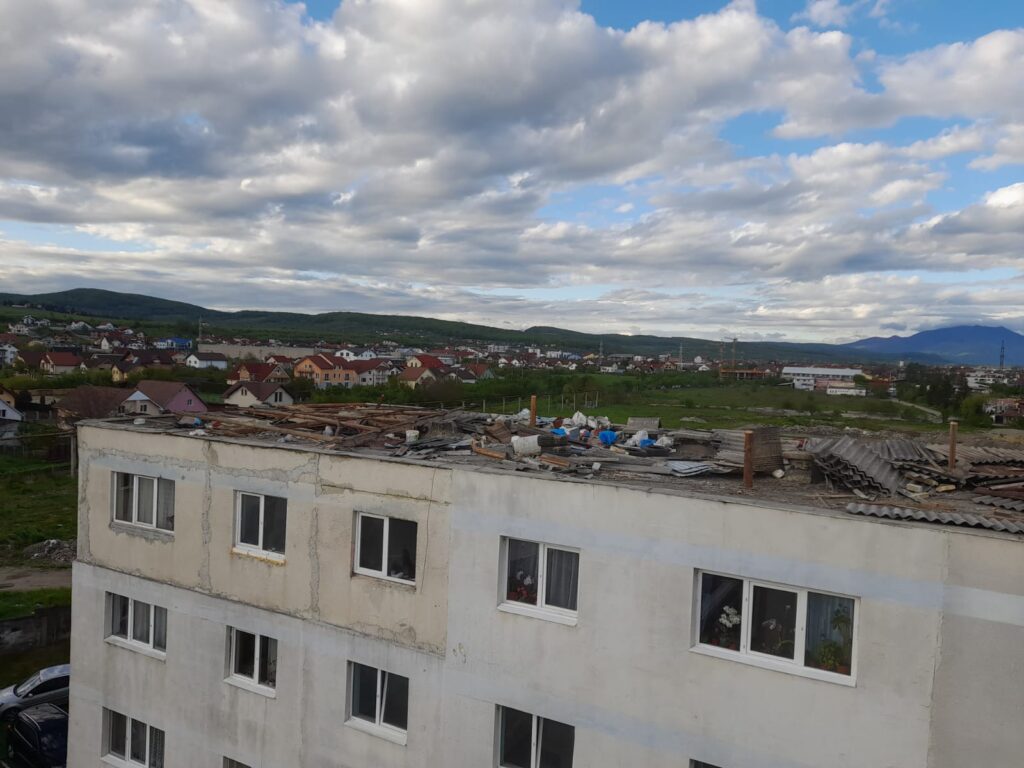 Potrivit Inspectoratului pentru Situații de Urgență Bistrița-Năsăud, pe strada Aleea Fântânele din municipiu, din cauza vântului, mai multe bucăți din acoperișul unui bloc s-au desprins și au căzut, câteva autoturisme parcate în zonă fiind avariate.