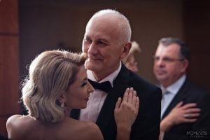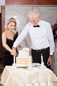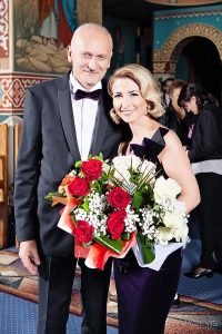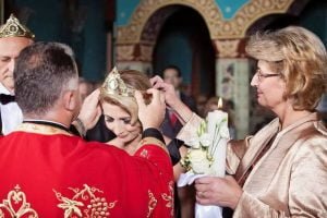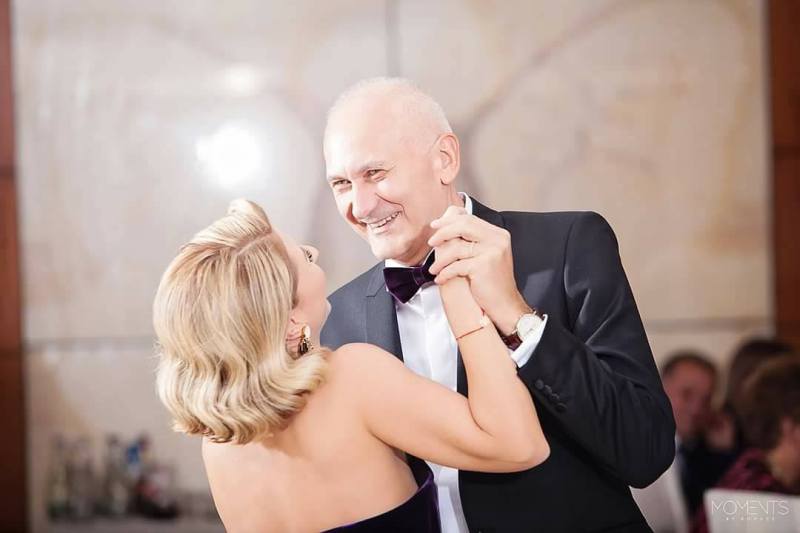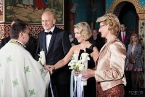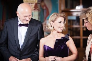 Petru Rai a purtat un costum clasic, negru, cu cămașă abă și papion de culoare mov, asortat cu rochia miresei.