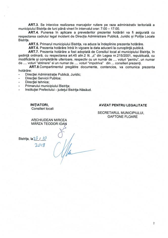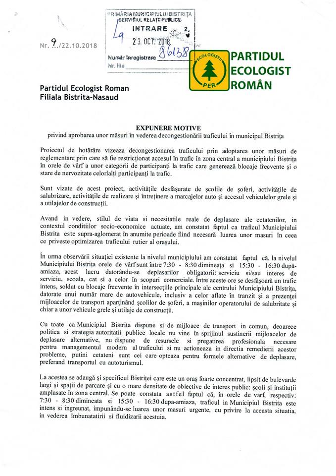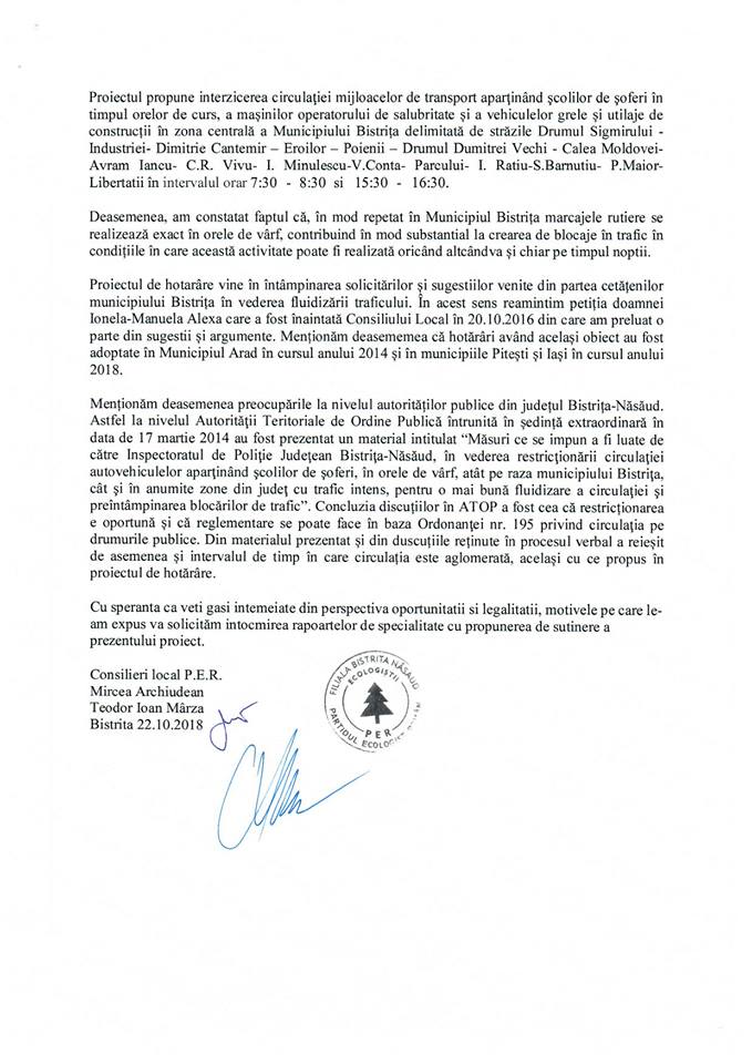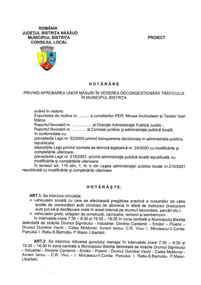 ”În vederea descongestionării traficului din Bistrița, am inițiat și depus spre consultarea publică în data de 23 octombrie un proiect de hotărâre care vizează adoptarea unor măsuri de reglementare prin care să fie restricționat accesul în trafic în zona centrală a municipiului Bistrița în orele de vârf a unor categorii de participanți la trafic care generează blocaje frecvente și o stare de nervozitate celorlalți participanți la trafic” mai completează Archiudean.