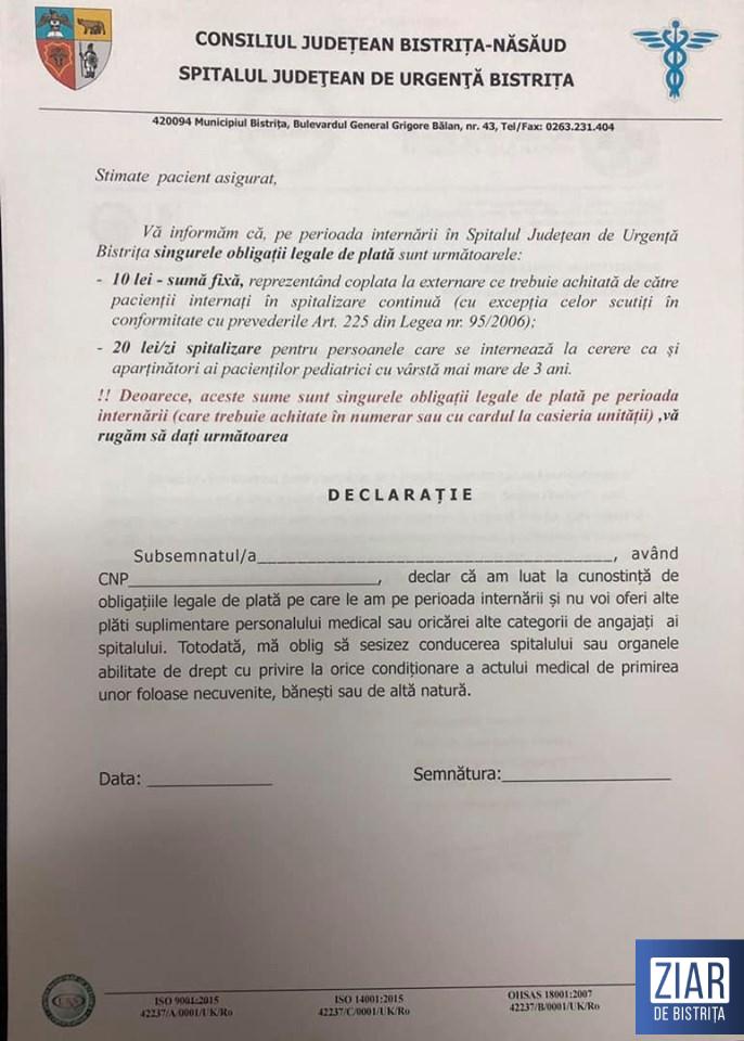 Managerul SJU Bistrița a mai completat că în ceea ce privește cazurile grave, în care actul medical este condiționat de anumite foloase materiale, acestea ar trebui sesizate din start, chiar la organele abilitate în acest sens, nu doar la conducerea unității medicale.