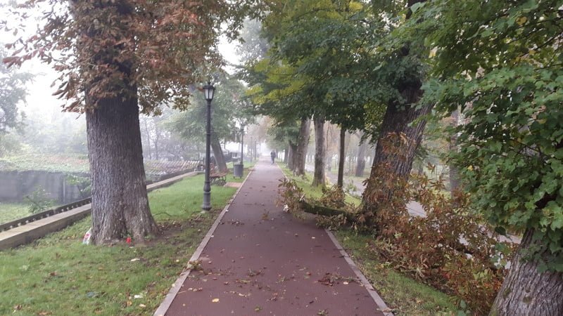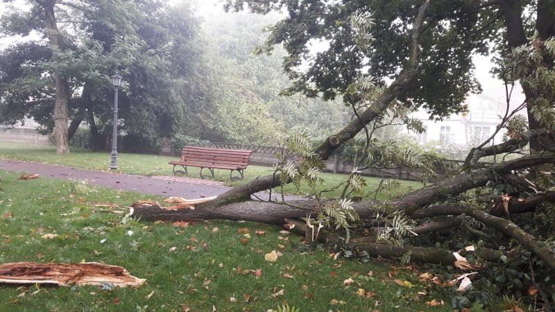 Imagini apocaliptice în Parcul Municipal, reabilitat din bani europeni. Copaci de mari dimensiuni s-au prăbușit în timpul furtunii de aseară, iar aleile principale au fost blocate de trunchiuri întregi. Ambele spații de joacă pentru copii au fost afectate de bucățile mari căzute pe caldarâm.