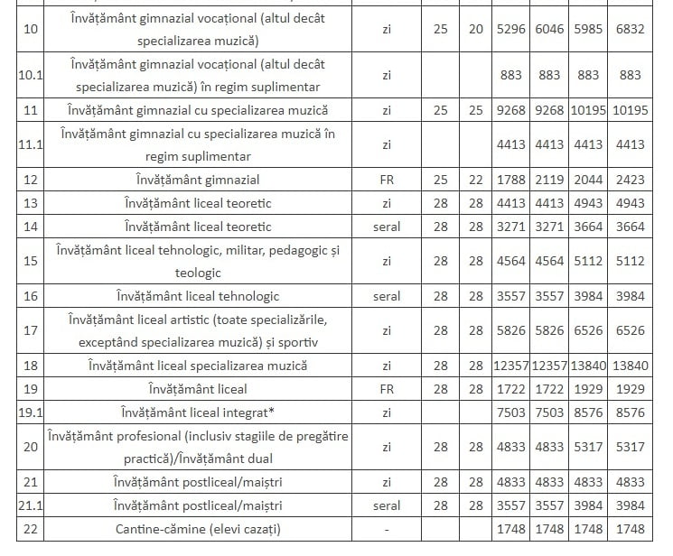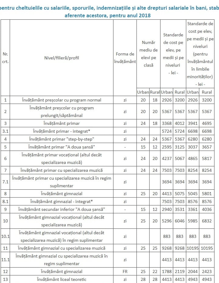 Prin modificările legislative, s-a stabilit un algoritm de calcul pentru aflarea costului/elev. Grila impune anumiți coeficienți, în funcție de zonă, tipul de unitate, zonă de temperatură, forma de învățământ. Acești coeficienți raportați la salariul profesorului și la cheltuiala cu bunurile și serviciile stabilesc costurile/elev.