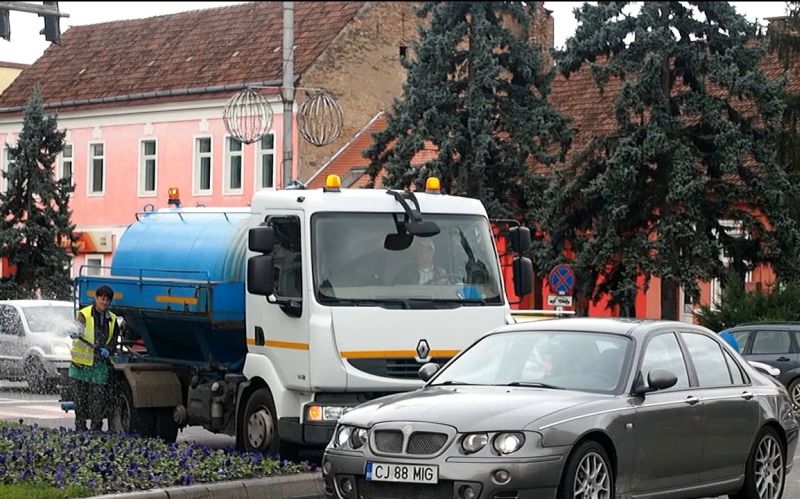 O mașină a Primăriei Bistrița a udat florile din zona Poșta Veche, efectiv blocând circulația, care se desfășoară cu dificultate în special în orele de vârf.