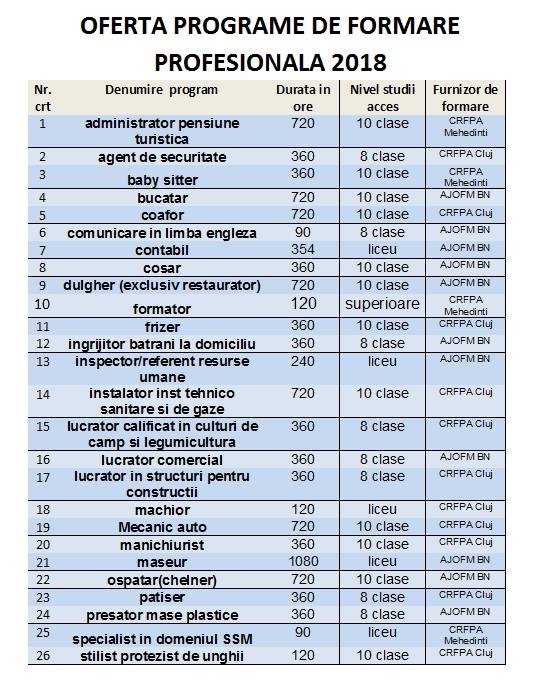Potrivit directorului AJOFM B-N, Otilia Râpan, ”planul de formare profesională pentru anul 2018 al Agenţiei Judeţene pentru Ocuparea Forţei de Muncă Bistriţa – Năsăud prevede organizarea a 37 de programe de formare profesională, care să cuprindă 601 de şomeri, în 26 de ocupaţii”.